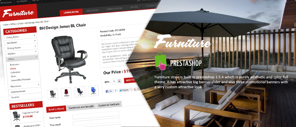 Furniture store is built in prestashop 1.5.4 which is purely aesthetic and color full theme. It has attractive big banner slider and also three promotional banners with a very custom attractive look.