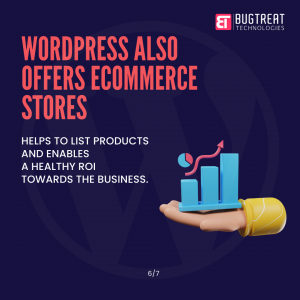 WordPress also offers eCommerce stores, WordPress + Ecommerce equals ” Woocommerce ” which helps to list products effectively and enables a healthy ROI for the business.