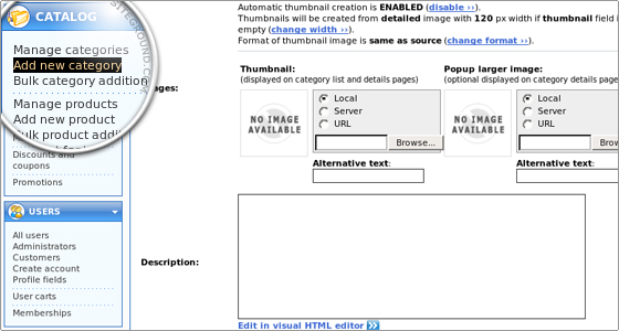 Once there, you can choose the category location, its name and an image for it. You can also add a description for the category, choose a page title, META description and keywords, etc: