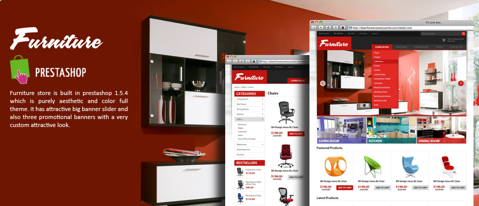 Furniture store is built in prestashop 1.5.4 which is purely aesthetic and color full theme. It has attractive big banner slider and also three promotional banners with a very custom attractive look.