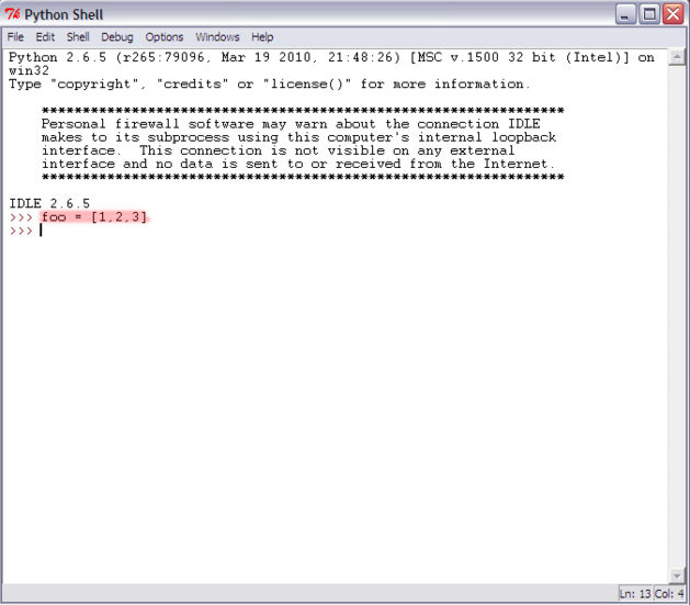 Third, the hard part. Type a left bracket, ([), then some kind of datatype. For example, a string is enclosed in quotes: ‘This is a string’. An integer needs no quotes: 56. For this list, we will use 1,2,3. So: [1,2,3]. What you have now should look like: foo = [1,2,3]. You could also use a string, like foo = [‘John’, ‘John2’, ‘John3’]. All list items are separated by commas.