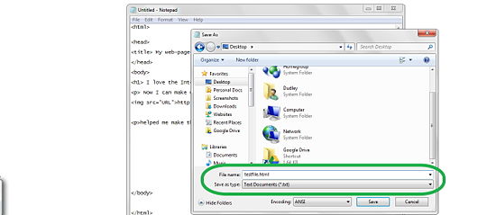11.Save your work. Go to “save as”, put a filename with an .html extension (such as “testfile.html”)and choose “all files” or “text” under file type. It won’t work if both are not done. Go find the page wherever you saved it, double click it, and your default web browser should open up your very own web-page.