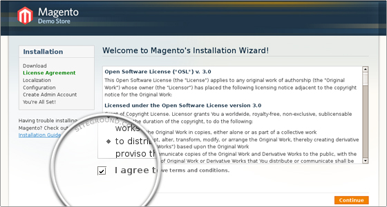 Step 4: In our example we will install Magento in the public_html/magento folder. Once the package is uploaded and extracted and you have a MySQL database, navigate to http://yourdomainname.com/magento: