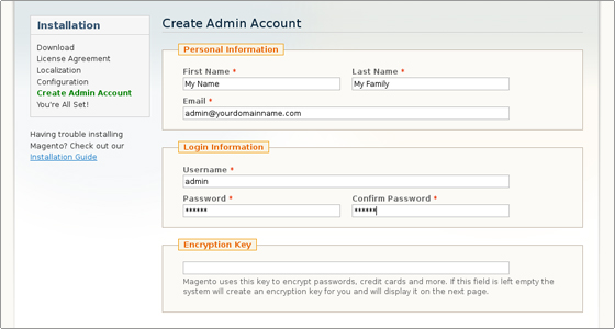 Step 7: At this point you must enter the personal information and the admin login details which you want to use. You can leave the Encryption Key field empty and the script will generate one for you.