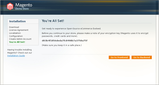 Well done! Your Magento installation was successfully completed. Now you can navigate to its Frontend or Backend.