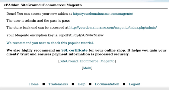 At the end you will get a confirmation screen with the URLs of your installation’s front and back ends, the Magento admin login details and the link to the SiteGround Magento tutorial. The Magento encryption key will also be visualized.
