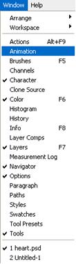 3.Open the animation palette by choosing “Window” from the menu bar and selecting “Animation.“ When the animation palette opens, it should look like the photo below. If it doesn’t, that means it opened in the timeline view.