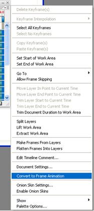 4.Change the frame animation view. Click on the “Flyout” menu in the upper right hand corner of the animation palette and select “Convert to Frame Animation.”