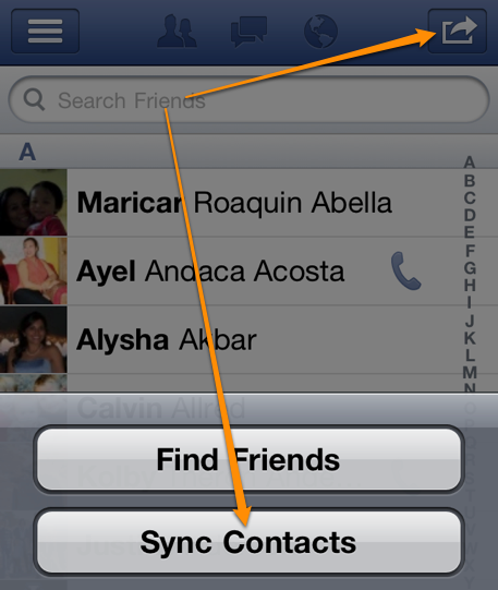 Next, on your friends list in the top right corner is a button that looks like the iPhone “Share” icon. Tap it to reveal the options to Find or Sync Contacts. Select Sync Contacts
