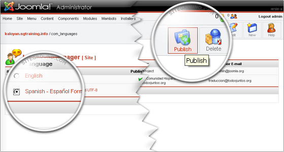 Wait for the confirmation and press the Continue.. link. From the listed languages select the new one and then click the [Publish] icon.