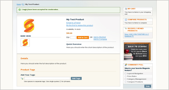 Let’s add a tag to our product, approve it and see how it then shows up on the product page. To add a tag to a product, simply write the tag word in the Add Your Tags: field available on the product page and click Add Tags. We’ll add “Great” as a tag. A confirmation message will show up saying that the tag has been accepted for moderation: