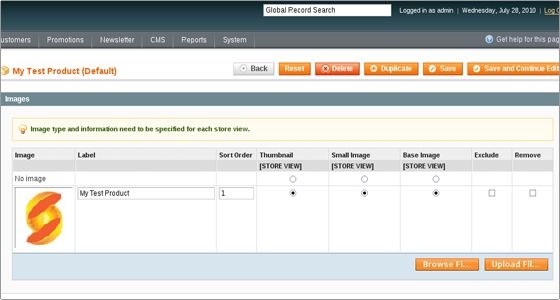 Click Browse Files and locate the file on your computer which you want to use as a product image. Then click Upload Files to upload the image to your store. Finally, label your image and choose where it should appear using the radio buttons on the right. Click Save to save your product’s image.