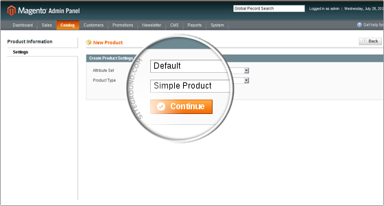 You need to select the product’s settings (Attribute Set and Product Type) and click Continue.