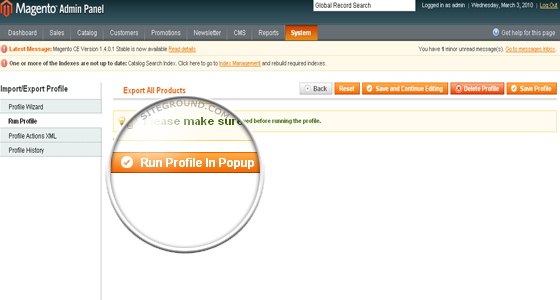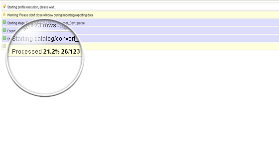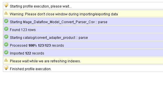 Once you have accomplished the above go back to the Magento administrator area and choose System -> Import/Export -> Dataflow – Profiles -> Import All Products. Then choose Upload file and browse for the .csv file that you have updated with the products that need to be imported. Once you have uploaded it click Import All Products again, then Run Profile, select the .csv file you have just uploaded from the drop down menu and click Run Profile in Popup. A status screen will open and the products will start importing