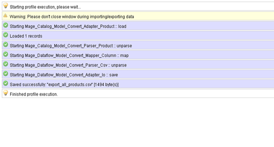 This will save a file named “export_all_products.csv” under the var/export/ directory for your Magento installation. The export success screen will look like this and will specify the file name where the products were exported.