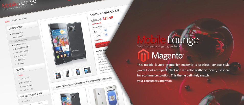 Bugtreat Templates – We are offering Magento templates free download and Premium Magento templates, Premium Magento themes, Magento skins with the good quality. We are recently launched a elegant Premium Magento Theme That is Mobile Lounge Premium Magento Template. This mobile lounge theme for magento is spotless, concise style ,overall looks compact ,black and red color aesthetic theme, it is ideal for ecommerce solution. This theme definitely snatch your consumers attention.