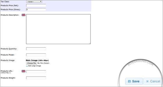 Enter the product description, the quantity of the product and its model. Images can also be uploaded from your local computer – osCommerce automatically creates a thumbnail. If you are linking to an external product page, please enter the address without the http:// part for the specific languages. Last thing to add is the product weight, since this will help in determining the shipping costs. When done, hit the Save button to keep the product or Cancel to skip this entry.