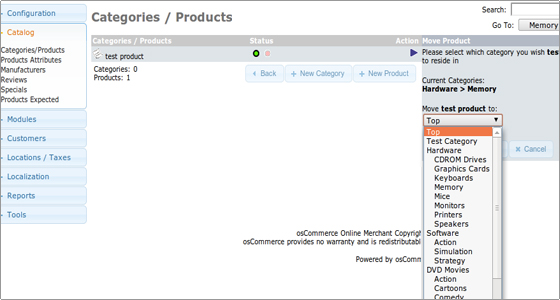 When you insert the product, you will be taken to the category/product list. If you wish to move the product in another category, click on Move, select the desired category from the drop-down list and click the Move button again.