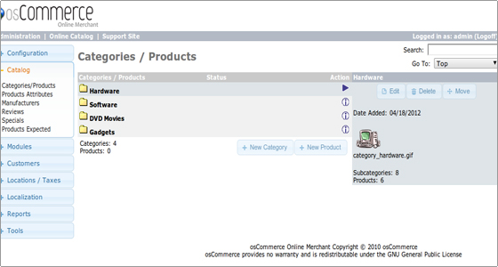 The next step is to include categories that will contain the products you will be selling in your store. To do that, please open the Catalog category from the administrator’s index page and click on Categories/Products. You will be taken to a page where the default categories are being displayed. You will be able to edit or delete an existing category, or add a brand new one.