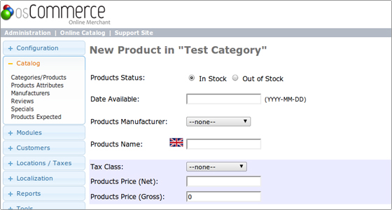 Select whether you have the product in stock or not. Then pick the availability date and the manufacturer. Type in the name of the product on the languages you have installed and decide whether the item is assessable or not; select the Net and the Gross prices.