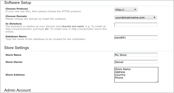 This is the most important step at which you need to offer more details about the new osCommerce website. Some of the fields are automatically filled by Softaculous for your convenience. However, we strongly advise you to review the values of the following crucial configuration parameters: