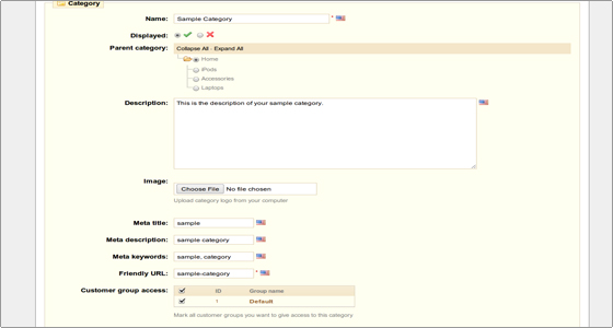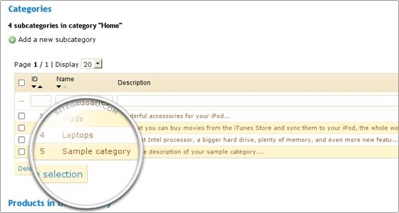 Now you can add some products to the newly created category. Go to the Catalog page again and click on the “Sample category” link in the table of categories.
