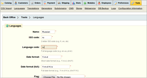 The language pack will be installed in few seconds. Now you have to add it as a new language for your website. You can do this from Tools -> Languages. You have to upload a flag image for the new translation, a “no-picture” image (when the flag image can not be loaded) and enter the ISO and the language codes of the country. If you want to install Russian for example, you should enter “ru” in these fields. When you are ready with this step, press the save button, and the new language will be ready to use.