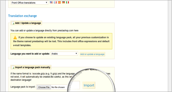 You can simply add more languages to your PrestaShop shopping cart website. To do that you have to download the required language pack file (in .gzip format) from the PrestaShop official website. Once you have downloaded the file, you have to login to the admin area of your shop. Choose Tools -> Translations. Now, simply browse to the language pack file in your local computer and press the Import button.