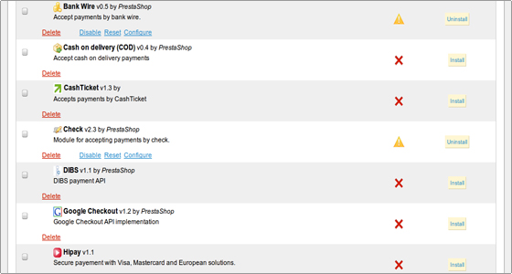 From this page you can install, uninstall and configure the supported payment methods. Currently PrestaShop allows you to use: