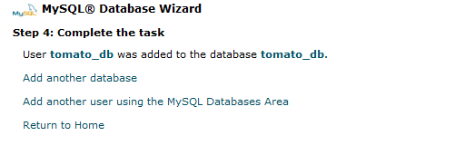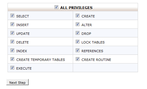 As you can see, the username is the same as the database (including the prefix) – tomato_db – this means a database named “db” of cPanel user named “tomato”. The rest of Step 3 is about giving the newly created username access to the newly created database. It takes place by clicking on the “ALL PRIVILEGES” checkbox, which automatically populates the checkboxes below it: