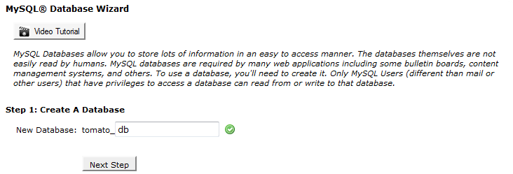 When the page loads, you will be on Step 1 of 3 for creating a MySQL database and assign a user to it. The MySQL database is used by TomatoCart to read and store information about your visitors and products, your settings and statistics. You can start by giving the database a name. For example, you can call it “db”. Upon creation, the database will be prefixed with your cPanel username and a _ sign. Here is how it goes: