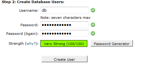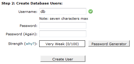 As you can see, in this tutorial, the cPanel username is “tomato” and the database name we have chosen is “db”. Therefore, the name of the database we should write down, as we will need it during the installation is “tomato_db”. In order for TomatoCart to use this database, though, it should authenticate. This is why, the second part of Step 2 is to create a MySQL user. We suggest using the Password generator tool, as shown below to generate the password. You will most probably never need this password, thus do not choose any of your common passwords, but use the one that will be generated by the tool. So, first you pick a name of the user and it is recommended to be the same, as the database. Then, you fill “db” in the first box: