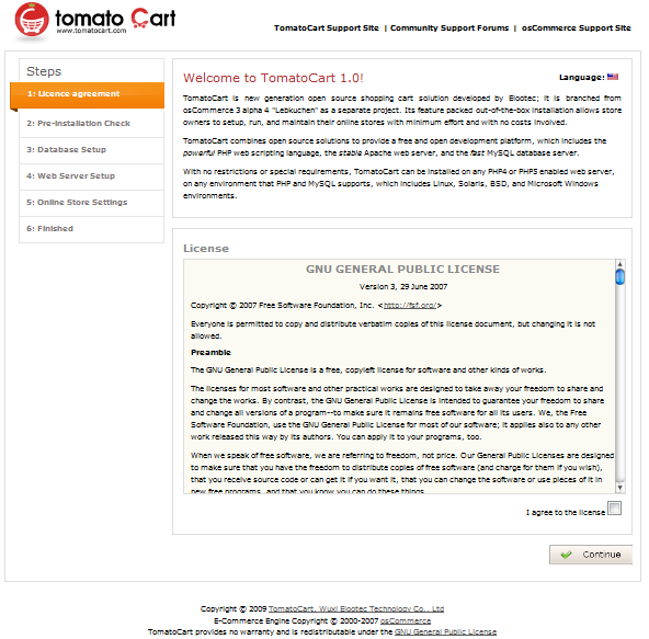 At it, you will be informed of the product’s license, terms and other stuff that you might be interested to read. It is basically about the open source license and its terms. You should state that you agree with the terms of the license, check the box on the bottom right and advance with the “Continue” button to the next step.