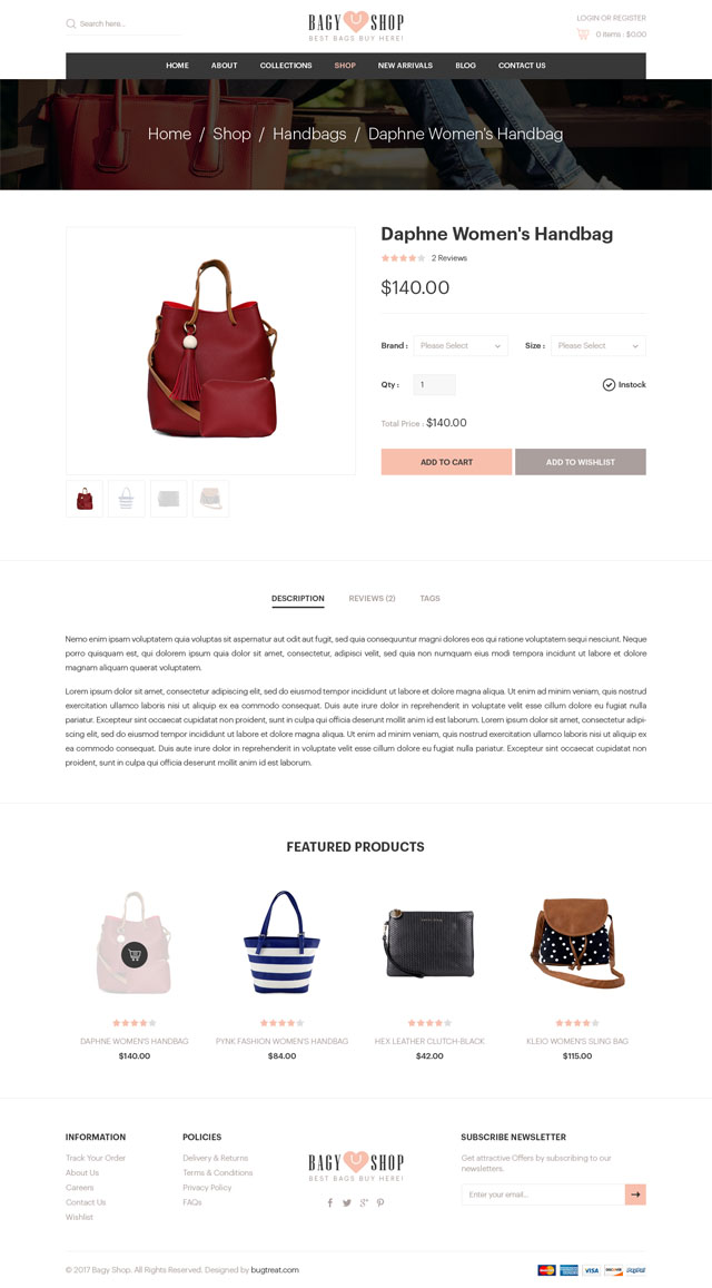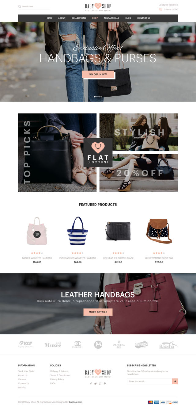 • Bagyshop is a Responsive Abantecart Template of Version of 1.2.11 is specially designedwhich is devoted for bagyshop products like Entertainment. It contains the unique and attractive design with a professional look. The Bagyshop is a type of Exclusive Leather Handbag A bagyshop is a handbags that consists of a Womens handbags in the center of a multi-lobed flat structure made from Leather and Top picks bags and Stylish designed.
