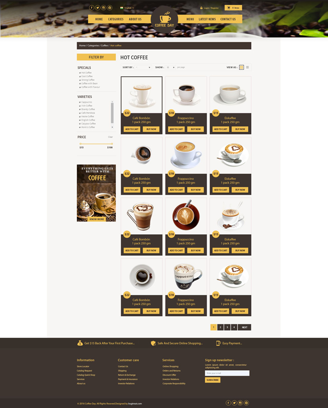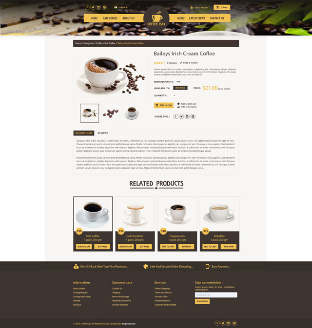 Coffee Day is responsive CS-Cart Theme, specially designed for coffee store but can be used for any Ecommerce store.It will allow you to create structure according to your needs and requirements. We are sured that it will statisfy all your needs that you are requiring and expecting from ecommerce solution. Grab it, Get real Experience & enjoy Coffee Day CS-Cart Theme!!!