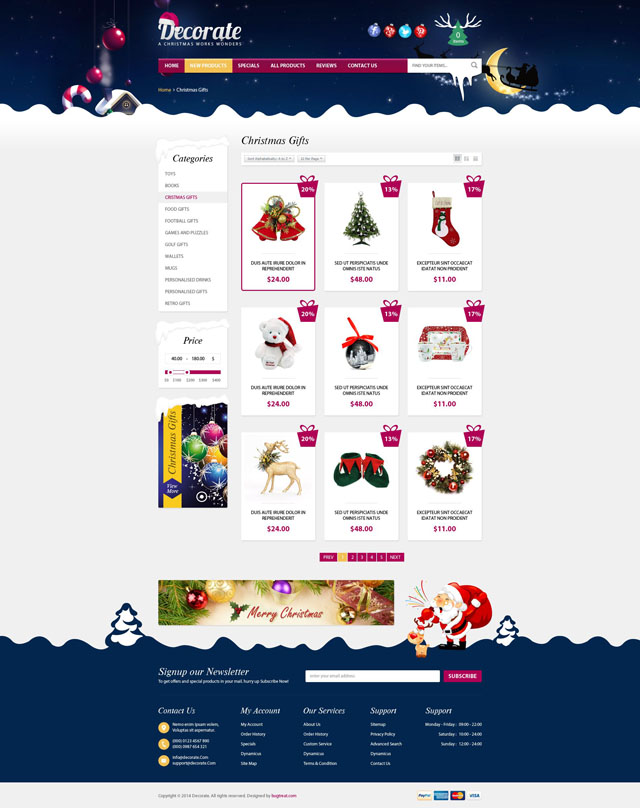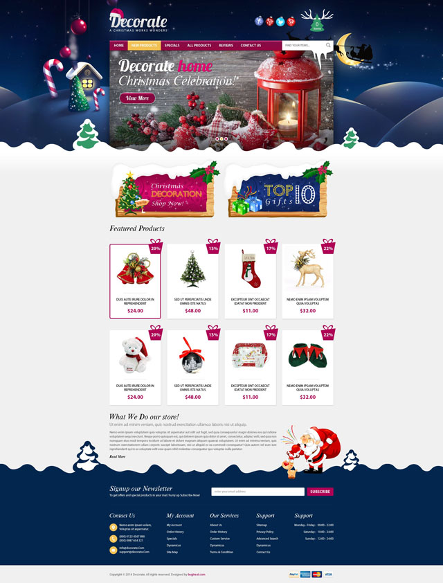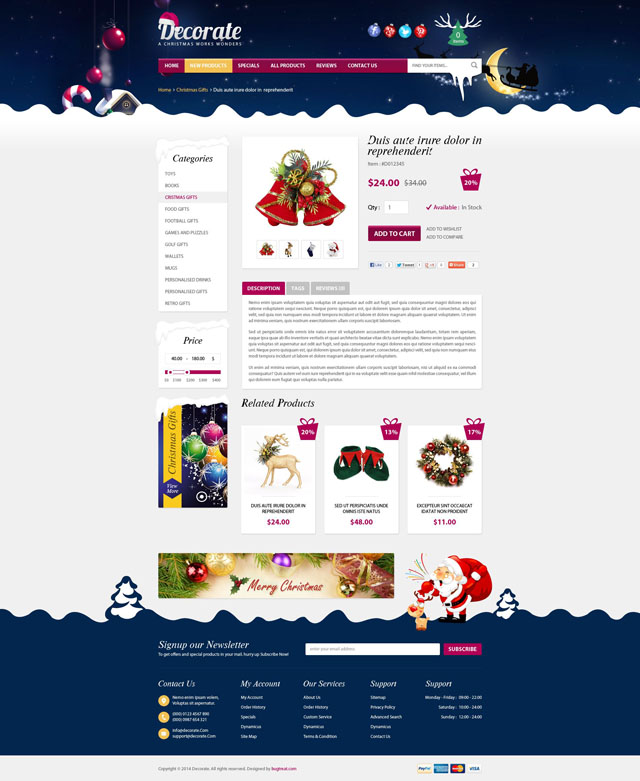 Decorate is a latest version cs-cart template is dedicated for Christmas Festive . This Template comes with powerful admin panel that allows you to control almost part in your site: layout, template direction, customize template width .With attractive theme colors and Great slideshow, nice banners making your site more beautiful.