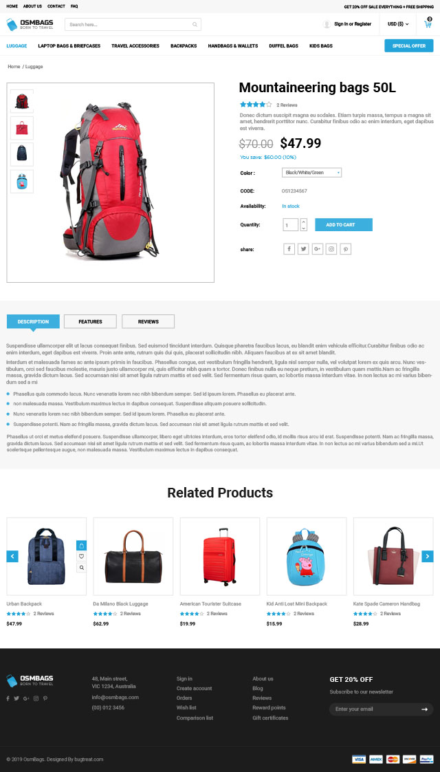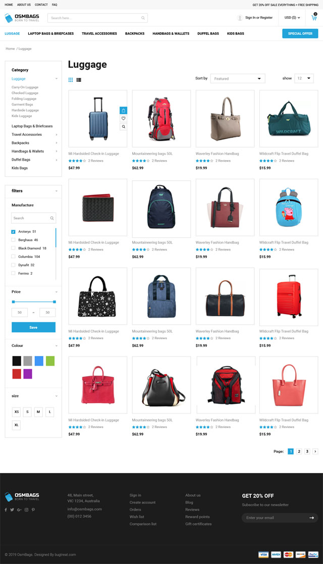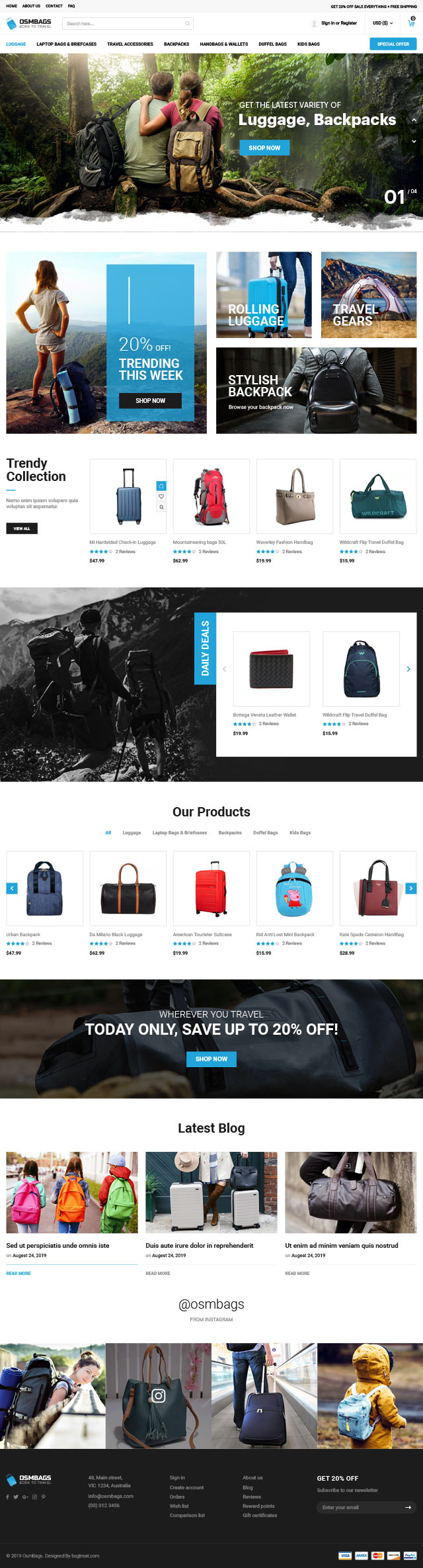 A great solution for buying Different type of bags like handbags, clutches, sling bags, backpacks, travel bags and laptop bags that’s Osm Bags cscart theme. This Osm Bags theme for cscart is entirely looks trendy and facinating, preferable for all kind of online stores.