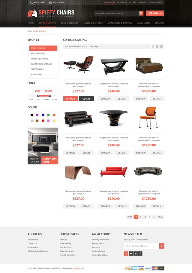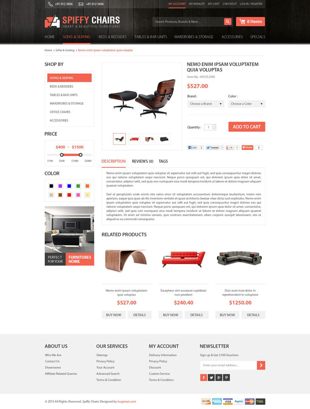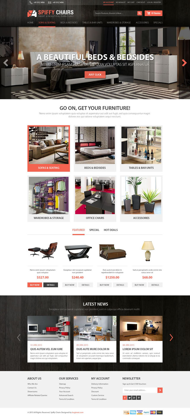 Spiffy Chairs is a latest version cs-cart template which is specially designed to sell out Home Decoration and Furnish like a Sofas,Leather Chairs,Bed spread and etc.... With attractive theme colors and Great slideshow, nice banners making your site more beautiful.