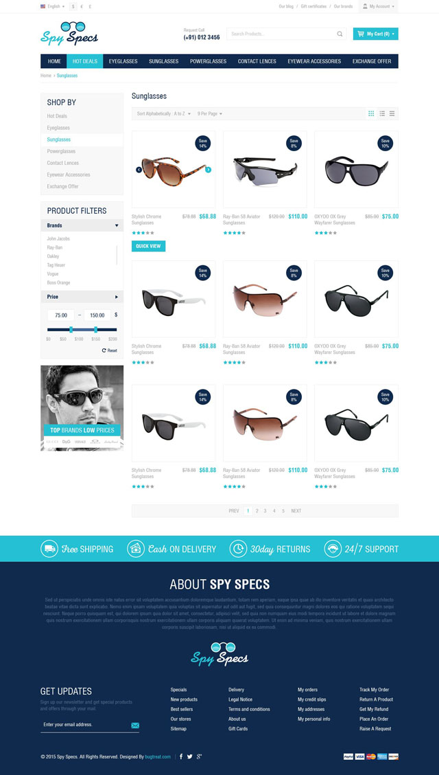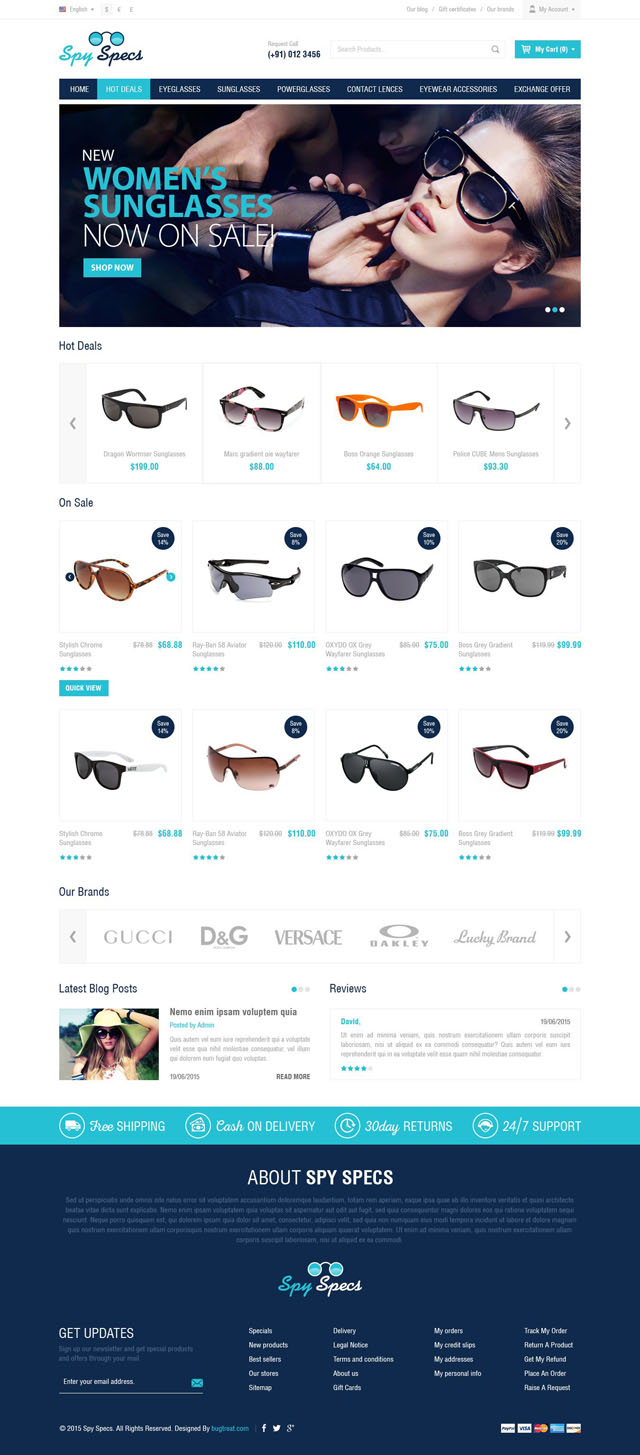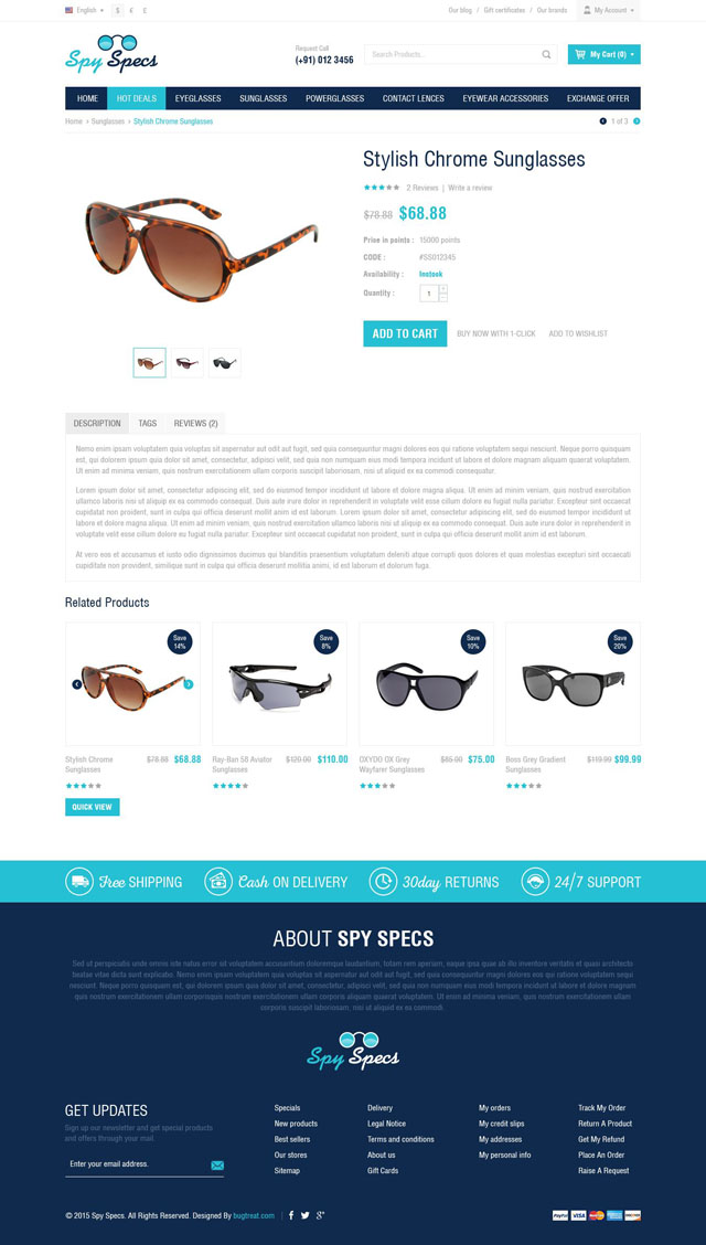 Spyspecs cs-cart template is a clean and minimalistic design with cool colors. Providing sunglasses, power glasses and eye-wear accessories make it easy and affordable to buy eye-wear online.
