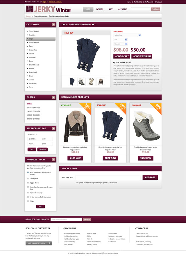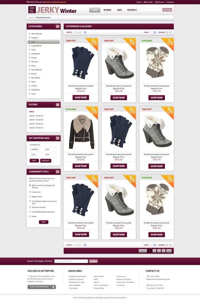 This jerky winter theme for magento is colorful, innovative banner slide style, very attractive on the whole , it is an ultimate theme for all kind of ecommerce solution. This theme will increase your product sales for sure.