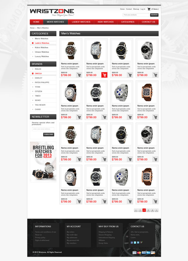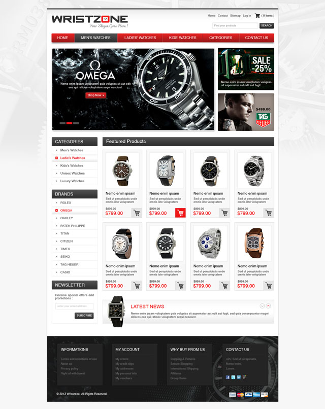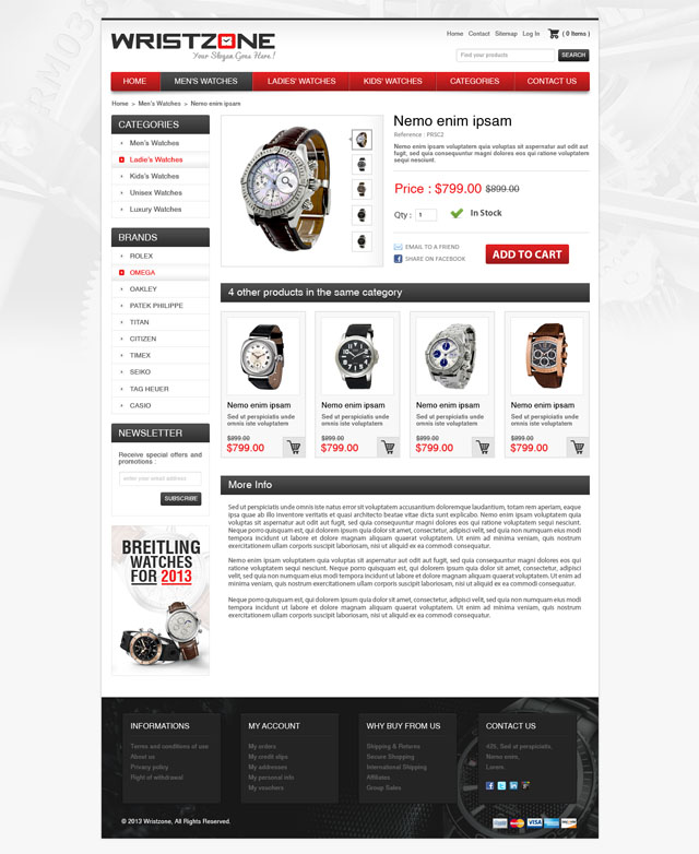 Wristzone is full white pale prestashop theme for selling watches, each part of the template is clearly structured to show your products in a good way. The big background image can be change to match your needs.